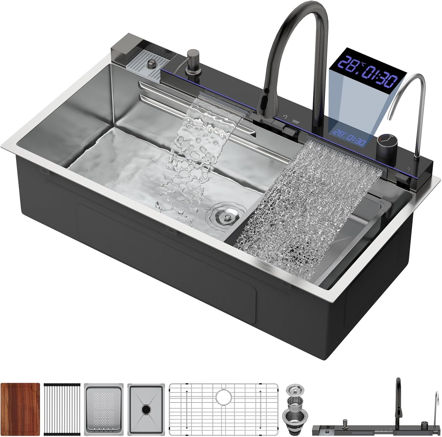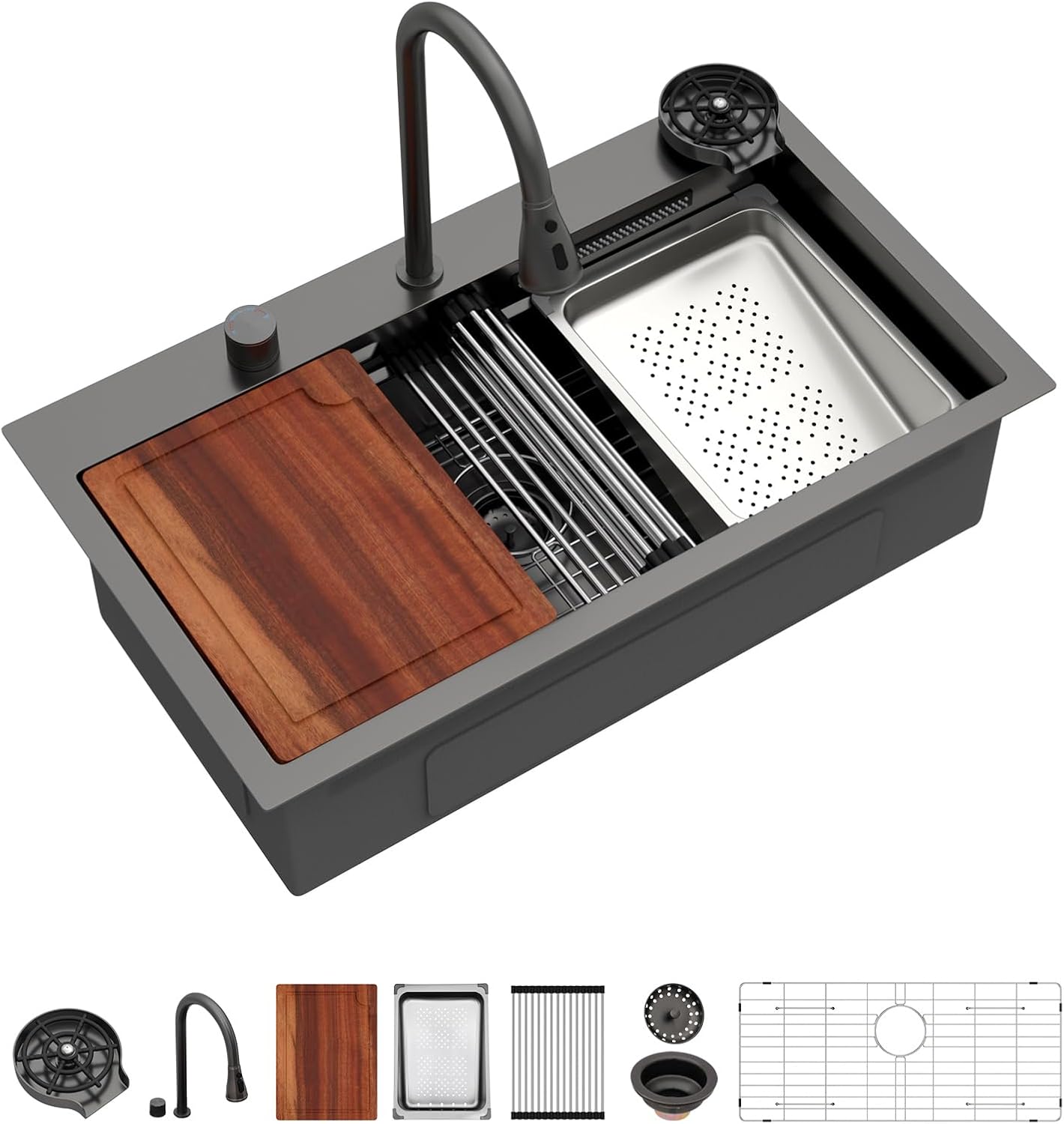| Included Components | 33 inch black waterfall kitchen sink, drain strainer, and cup rinser, faucet one-unit kit, cutting board, colander, roll-up rack, rinse grid |