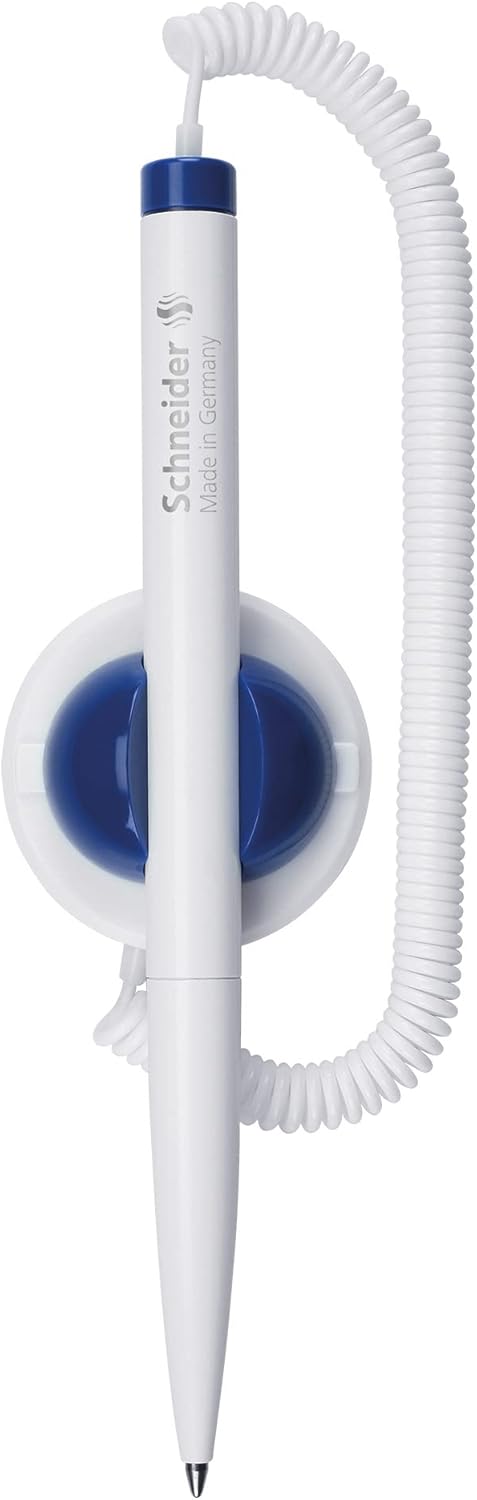 Klick-Fix-Pen ballpoint pens With attached coil cord - perfect for any time you need a fixed ballpoint pen. The push-button Klick-Fix pen is self-adhesive; the clip can be turned to any position. Comes with replaceable indelible Express 775 cartridge with non-clip stainless steel tip. Tip size: M; ink colour: blue. Barrel colour: white / blue.