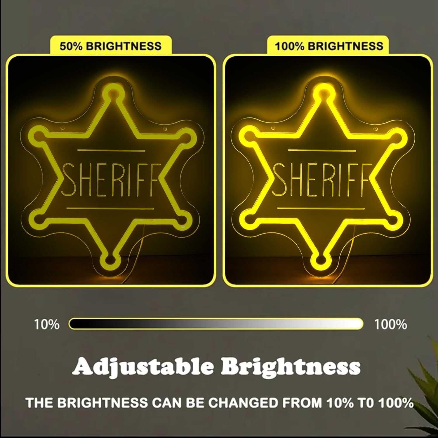 Illuminate your space with this eye-catching LED neon sign that reads 'Sheriff .' Perfect for creating an energetic atmosphere at birthday parties, special events, or as a striking wall decoration. The dimmable feature lets you adjust the brightness to match any mood or setting. Measuring 8.9 x 15.7 inches, this statement piece adds a modern, vibrant touch to any room while providing a captivating backdrop for photos and social gatherings. The LED technology ensures a bright, clear display while staying cool to the touch. Whether mounted in a game room, party space, or as bedroom decor, this neon-style sign brings a fun, contemporary vibe to your interior design. The sign comes ready to hang and makes an impressive focal point that's sure to spark conversation at your next celebration.